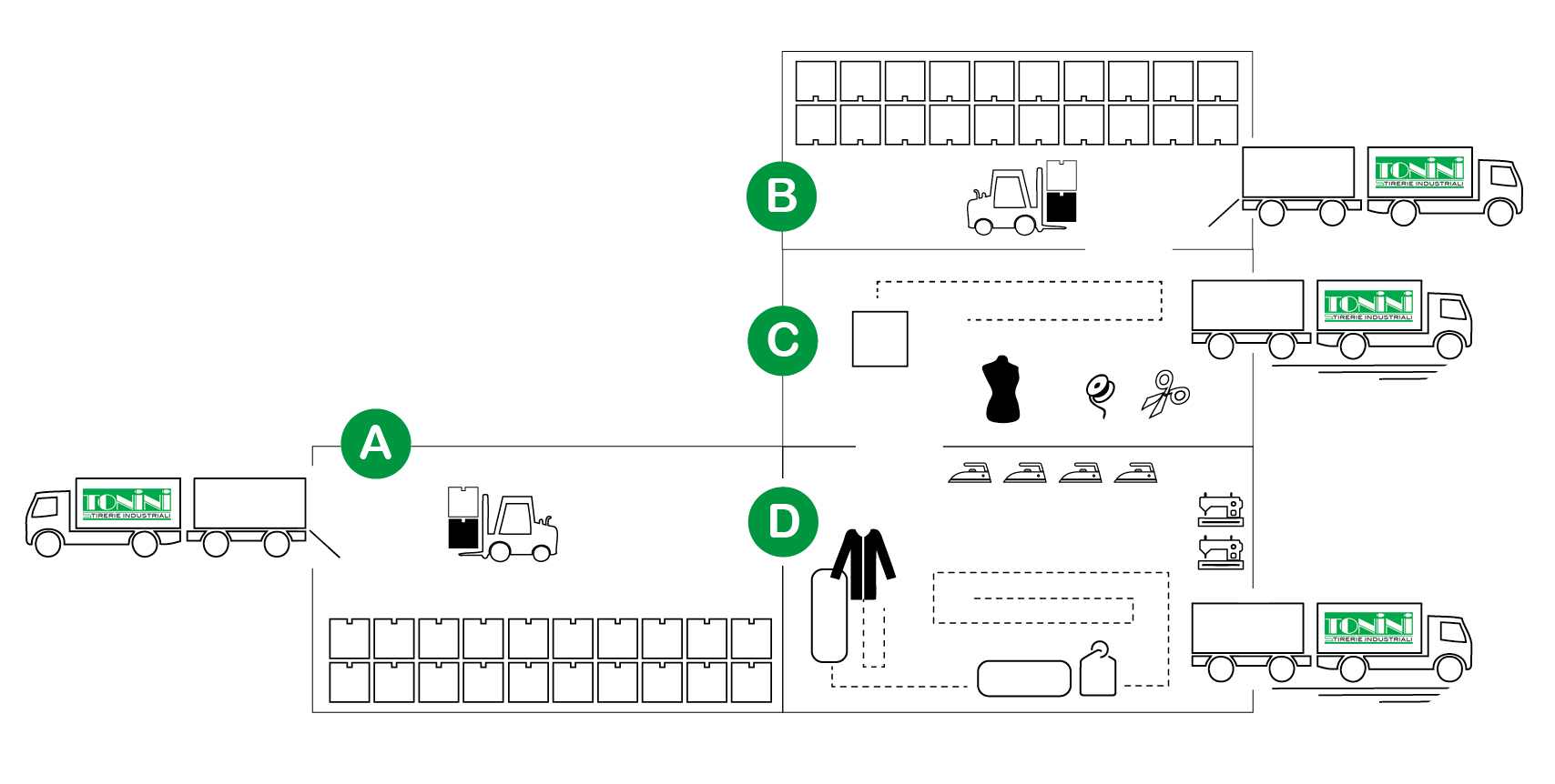 Area di controllo qualità, suddivisione dei capi, stiro commerciale e spedizione del prodotto finito.
